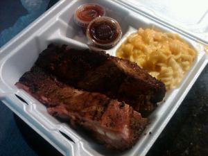 car. The meal included two large ribs (these are not baby back) that had a flavorful smokey taste with a very slight sweet taste (they smoke their meats with a variety of fruits and vegetables to complement the wood and charcoal). Despite the drive and the carryout aspect the ribs had not dried out and were juicy enough to require a little stack of napkins. Inspire offered several BBQ sauces; we tried the hot one and the sweet one. For the ribs, skip the sweet one because they already have a slight hint of sweetness and need no more. If you feel like fire, give the hot one a try–it’s not the spiciest sauce you will ever try, but it provides a little kick. The macaroni and cheese did not disappoint either, although perhaps the grease could be cut a little bit.