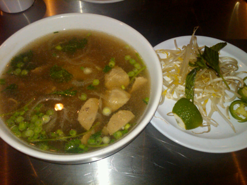 restaurant’s namesake, pho ($10). The Pho Bar Combination may be tempting because it gives you a little bit of everything, but you are better off skipping it and going with the round eye steak pho. The pho has a nice base flavor that can be improved by adding healthy amounts of the basil, lime, and chilies that they provide on the table or bring with the bowl. The steak is not as tender as we would hope, but that can be mostly overlooked by the quality of the broth and the overall taste. Avoid the meatball pho (or the combination) because you will get a bunch of very grey meatballs that have little specks of fat that are not very appetizing; the steak pho is much better.