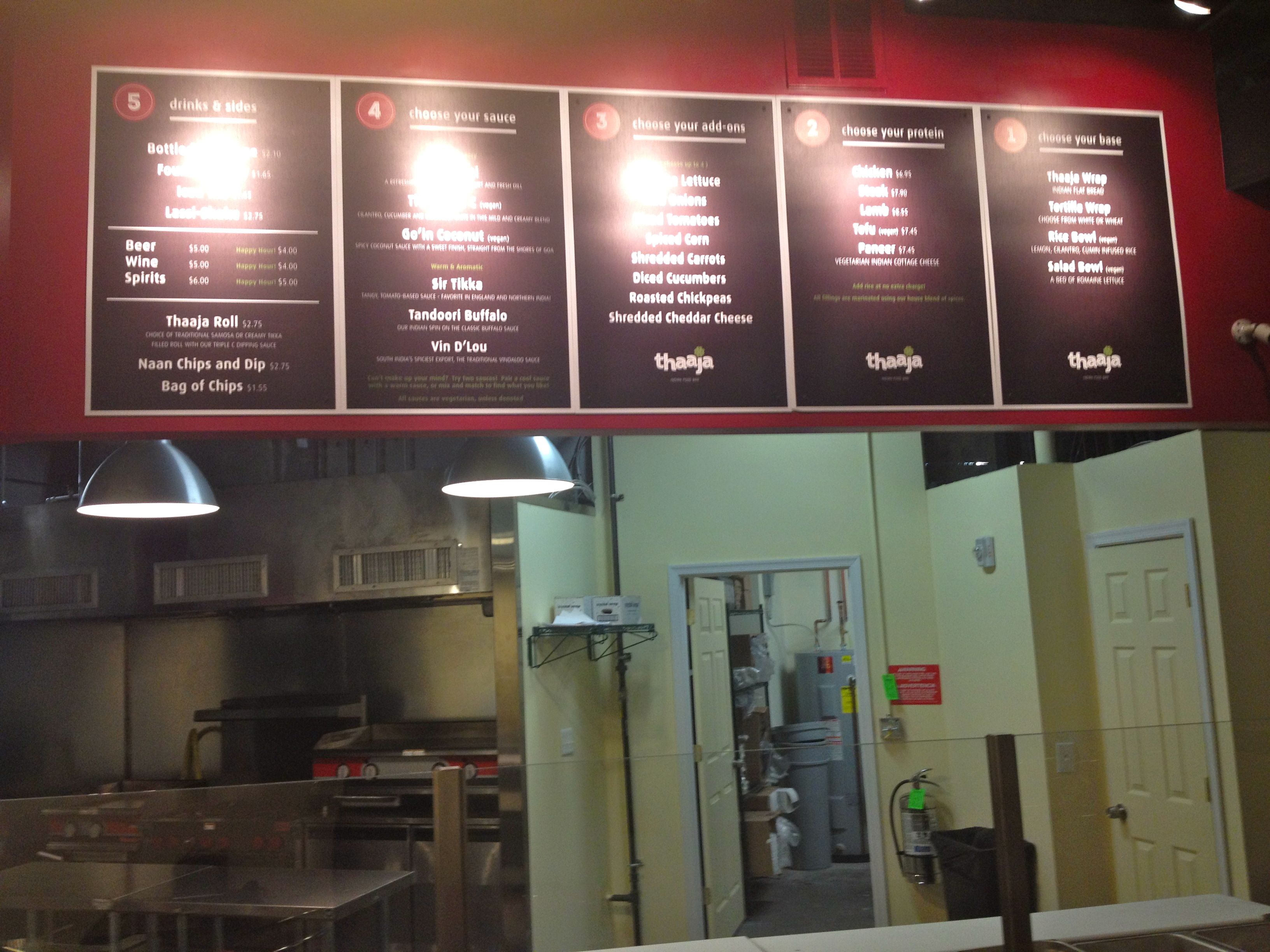 In addition to its food and Lassi shakes, Thaaja will also have a variety of drinks. Thaaja will have several beers, including Kingfisher (from India), Flying Fish, Agave Wheat, and then several standard bar beers (Bud Light, Corona, and Stella). They will also serve several wines in individual serving bottles as well as several mixed drinks. Thaaja hopes to attract a strong happy hour crowd as from 4-8pm everyday all beers and wines will be $4 and all mixed drinks will be $5.