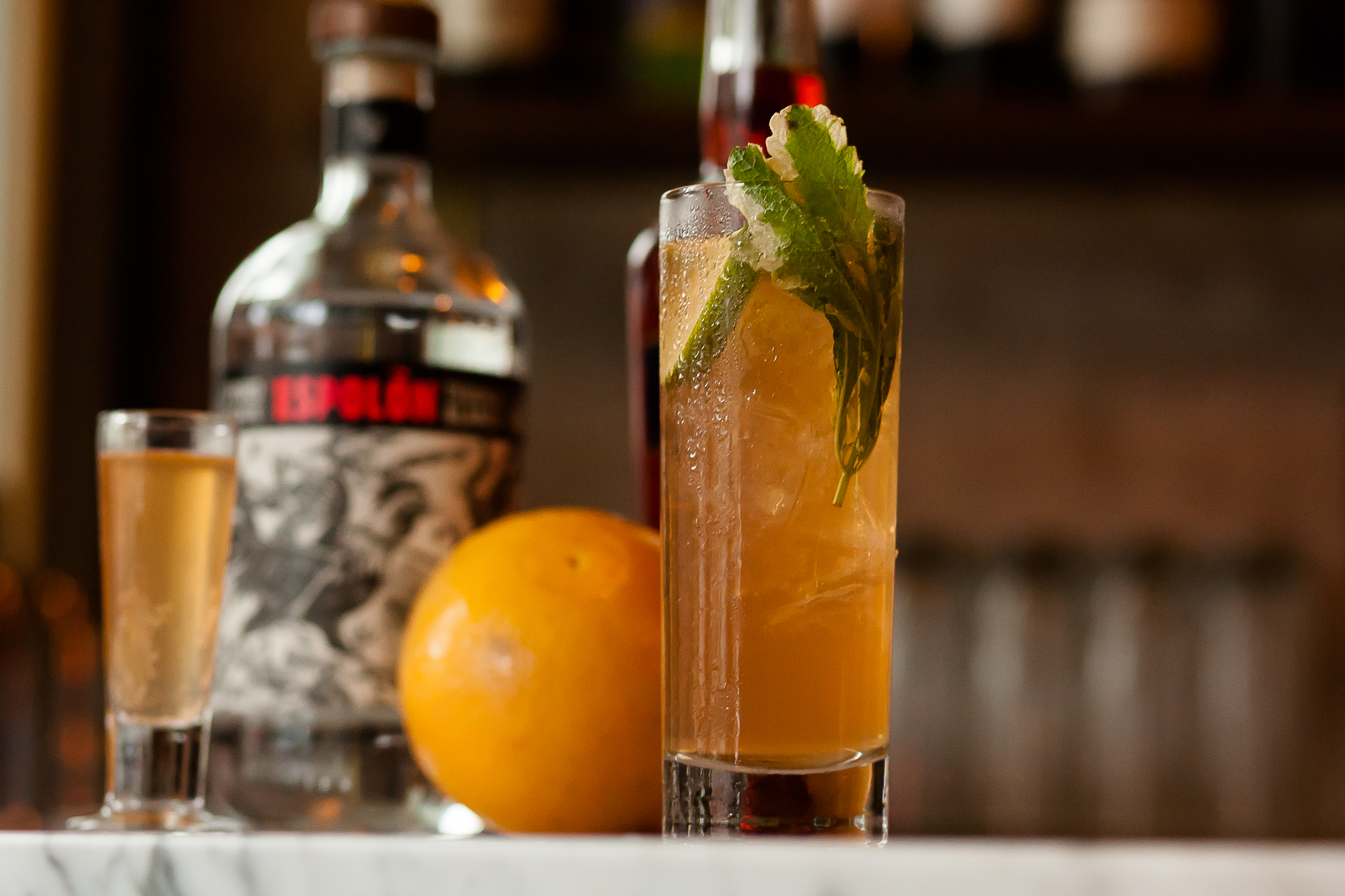 - Que hora son?–inspired by a Paloma cocktail, grapefruit juice is turned into grapefruit water through a gel agar clarification process that involves mixing the grapefruit juice into a gelatin that is then run through a small sieve (this process was perfected by Dave Arnold a famous mixologist in New York City). The grapefruit water is mixed with aperol, triple dry, Espolon Blanco tequila, salt, malic acid, honey syrup, and phosphoric acid. It is then put into bottles where it is carbonated prior to being served with lime and pineapple mint.