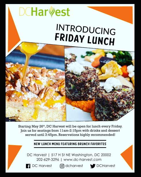 DC Harvest (517 H Street, NE) will be launching Friday lunch service tomorrow, May 26th, from 11 am until 2:15 pm. The menu will be very similar to the restaurant’s weekend brunch menu but with a couple of additions including a grilled Chesapeake catfish salad and a fried old bay turkey sandwich. Reservations can be made either by calling the restaurant or through their website.