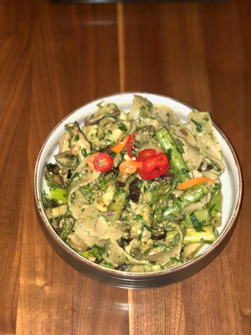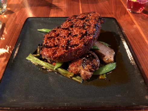 District Cuisine stopped by recently to explore the new items and experiences. We started out with the cherry blossom cocktail that has been added to the bar menu for spring. The cocktail features Leopold Brothers Maraschino liquor, rhubarb bitters, rosewater, and prosecco for a drink that balances sweetness with refreshment perfectly. If the cocktail stays on the menu as the weather continues to heat up, we will likely be back to cool off on humid days with one of these. After sharing some of the bacon and asiago “doughnuts” (admittedly a staple from the appetizer section of the menu), we tried the pan roasted cafe steak with peas, sunchokes, onions, and smokey mustard vinaigrette steak sauce. We were unacquainted with the cut previously, but it was a tender and flavorful piece of steak that was grilled medium rare and paired nicely with the veggies. While not a traditional steak sauce, the mustard vinaigrette was delicious. We also tried the papperdelle with a trio of spring vegetables: asparagus, artichokes, and shiitake mushrooms. The pasta was topped with a ramp pesto and slices of chilis that added a spicy pop to the dish. The fresh pasta and ramp pesto combined nicely with the spring vegetables to be a true taste of all the season has to offer.